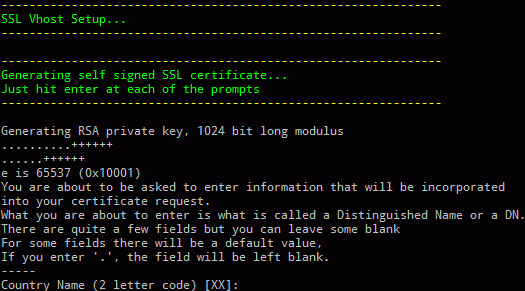 At the SSL Vhost setup step, you will need to generate a self-signed SSL certificate, just hit enter at each of the prompts to continue.