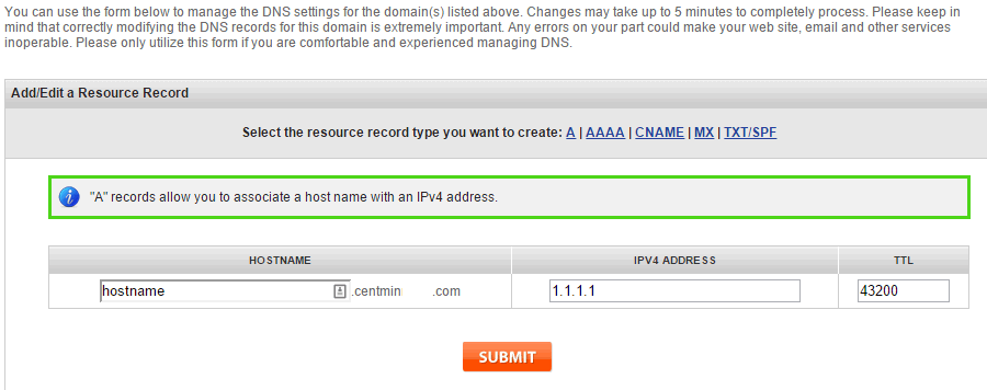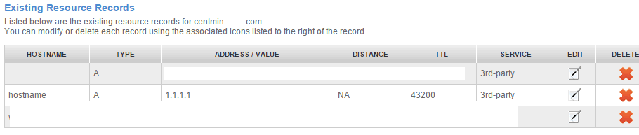Here's an example from Namesilo.com DNS management area for adding a DNS A record for hostname.mydomain.com pointing to server IP address = 1.1.1.1.