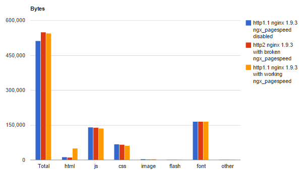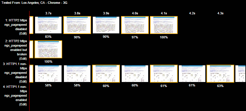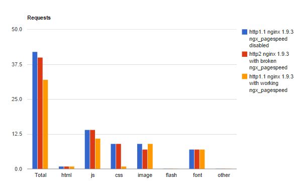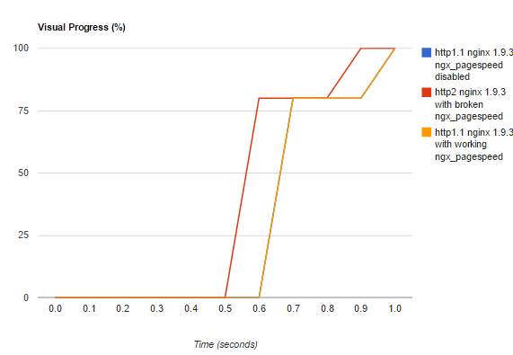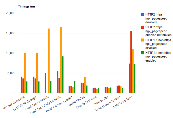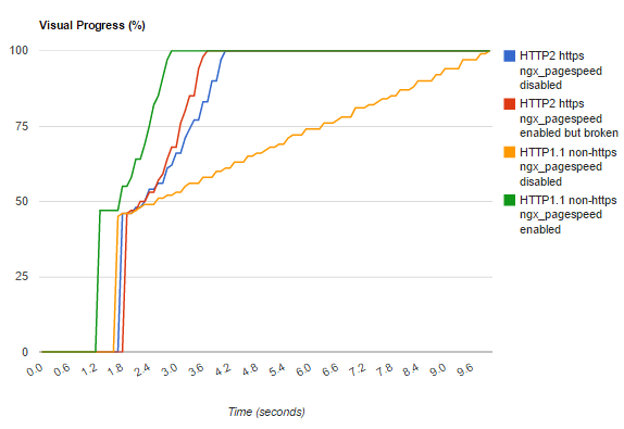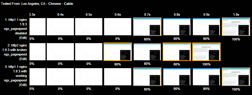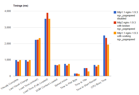 Webpagetest.org comparison test for centminmod.com for testing HTTP/1.1 + ngx_pagespeed, HTTP/1.1 + ngx_pagespeed disabled and HTTP/2 without ngx_pagespeed. This site probably isn't the best example for HTTP/2 or ngx_pagespeed usage due to minimalistic design. The more page elements - js, css, and images the page has, the greater the benefit HTTP/2 and SPDY would have. Just bare that in mind.