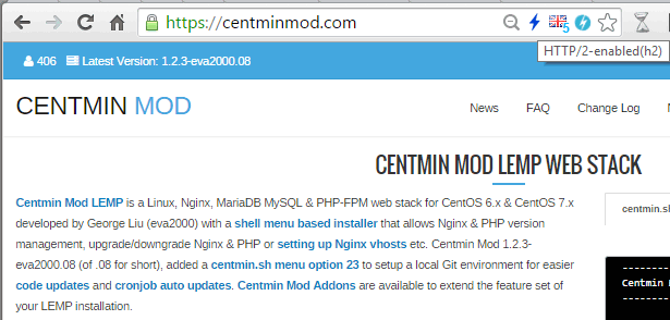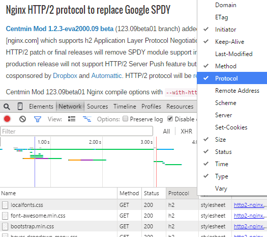 Centmin Mod 1.2.3-eva2000.09 beta (123.09beta01 branch) added support for Nginx's new HTTP/2 alpha patch [nginx.com] which supports h2 Application Layer Protocol Negotiation (ALPN) TLS extensions. Installing the Nginx HTTP/2 patch or final releases will remove SPDY module support in Nginx. Unfortunately, the HTTP/2 patch or first production release will not support HTTP/2 Server Push feature but future versions may. The Nginx HTTP/2 patch was cosponsored by Dropbox and Automattic. HTTP/2 protocol will be replacing Google's SPDY protocol in early 2016.