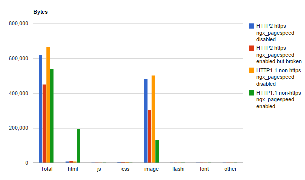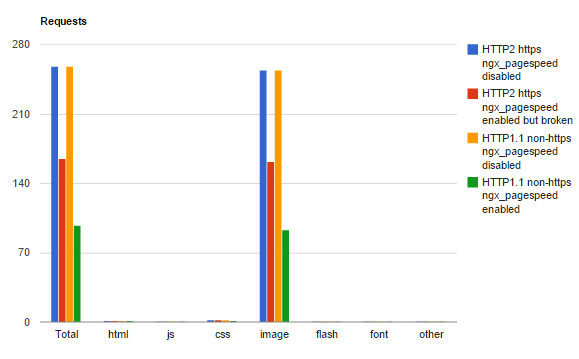 The Nginx HTTP/2 vs non-HTTP/2 results with ngx_pagespeed confirmed the same results I had when I tested h2o HTTP/2 and OpenLiteSpeed HTTP/2 World Country Flags tests. Nginx HTTP/1.1 + ngx_pagespeed was still the fastest combination, then Nginx HTTP/2 + ngx_pagespeed (even if it was broken), then Nginx HTTP/2 and slowest by far was Nginx HTTP/1.1 with ngx_pagespeed disabled.