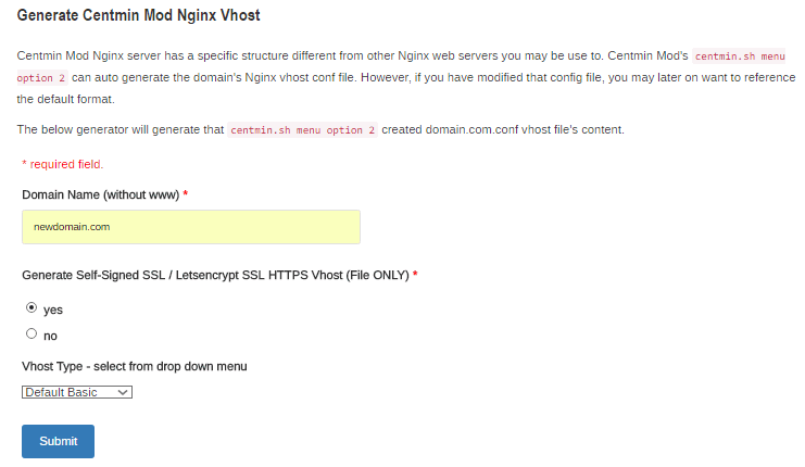 Use the official site Nginx Vhost generator to check the Generate Self-Signed SSL / Letsencrypt SSL HTTPS Vhost checkbox and fill in on the domain input form the desired domain name you want to migrate or setup Nginx HTTP/2 based HTTPS Vhost. I'll be using the example domain, newdomain.com throughout this guide. The for Vhost Type drop down menu select the appropriate Vhost template. For this example the Default Basic Vhost template is chosen. Then hit submit. You'll be greeted with the full manual instructions to setup the Centmin Mod Nginx HTTP/2 HTTPS Vhost with Letsenecrypt SSL certificates. The rest of the steps below are just highlighting these outputted full manual instructions.